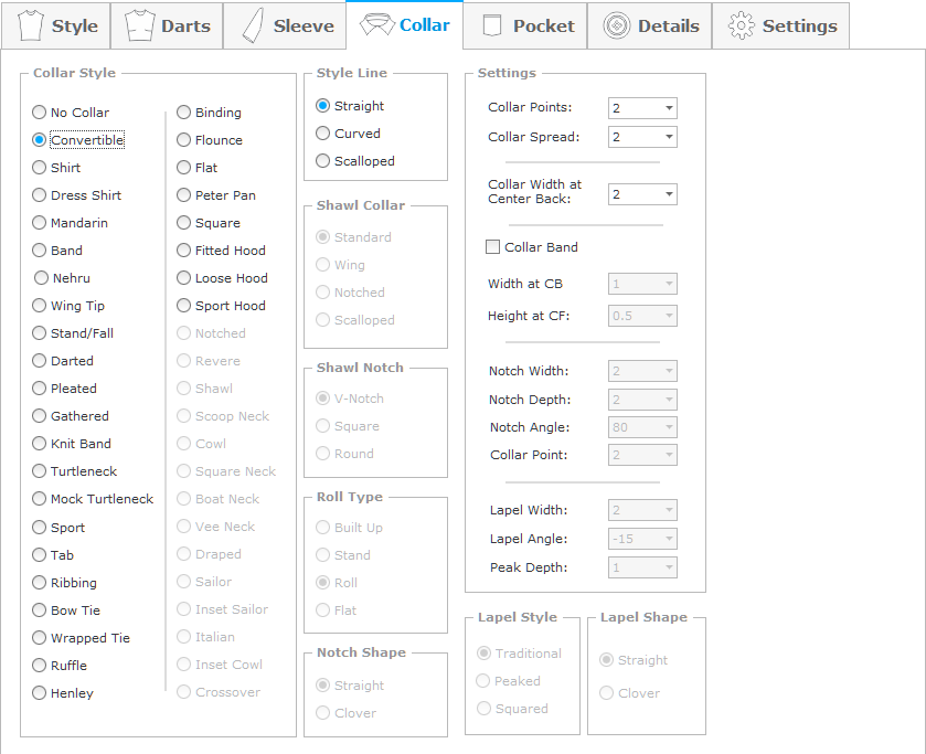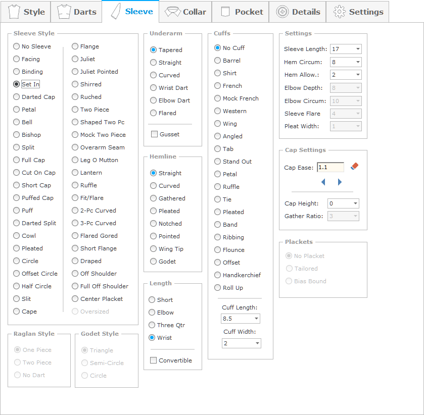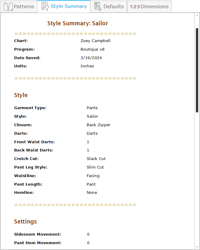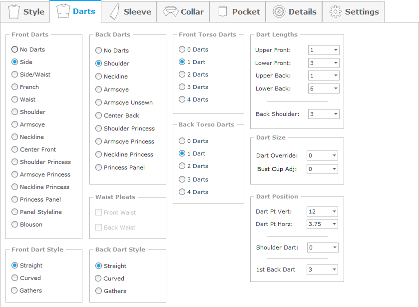 In PatternMaster, you can choose from dozens of necklines, darts, closures, collars, sleeves, cuffs, and pockets. All PatternMaster programs print a comprehensive style summary with front and back style sketches, all relevant design and fit settings, and body and finished garment measurements.